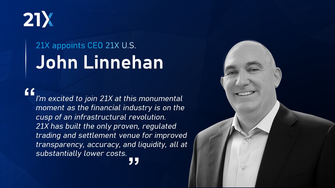 The appointment of Linnehan, a seasoned investment management executive and fintech entrepreneur with extensive C-suite experience for large, complex financial institutions, will be instrumental to 21X’s strategy of achieving regulatory approval and scaling of its blockchain-based trading and settlement infrastructure in the world’s largest capital market.