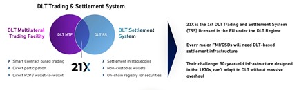 21X addresses this question as the first operator of a fully regulated DLT Trading and Settlement System (DLT TSS) under Regulation (EU) 2022/858.⁵ Structurally, the platform combines two functions that have traditionally been separated: